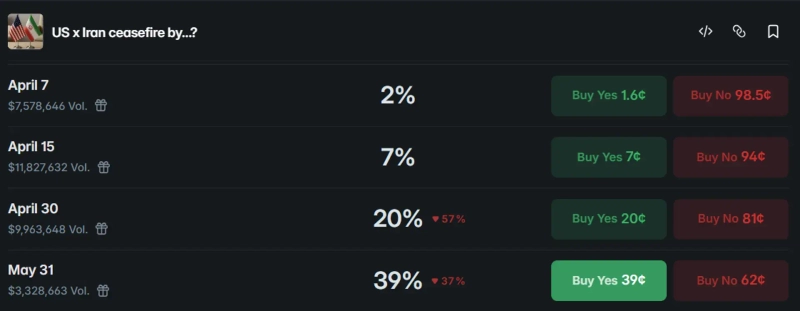 - On Polymarket, the probability of a U.S.-Iran end to the war before June fell to 39%, plunging 37% from the previous day.