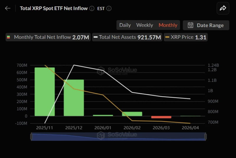 - Spot XRP ETFs recorded their first monthly net outflow in March, followed by additional fund outflows in April, signaling weaker institutional demand.