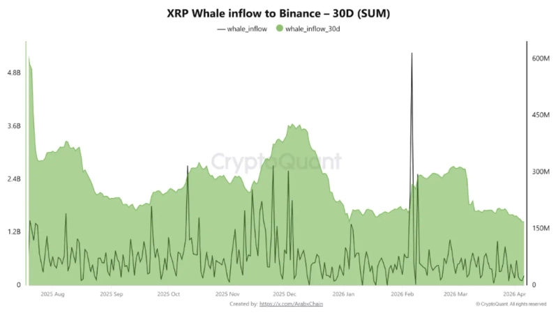 Whale activity, however, paints a somewhat different picture. According to Arab Chain, a CryptoQuant contributor, whale inflows to Binance recently fell to their lowest level of 2026. Daily average inflows were about 12.6 million XRP, far below periods when hundreds of millions of XRP were moving onto the exchange.