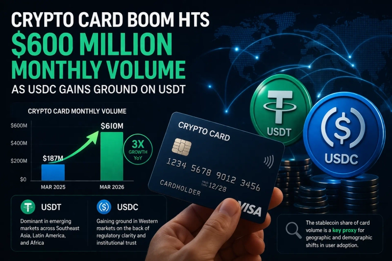 The Block reported on April 8 that monthly crypto card payment volume reached about $600 million in March, more than tripling from $187 million a year earlier.