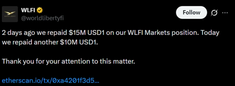World Liberty wrote on X on July 11 that it repaid $15 million of USD1 from its WLFI market position two days earlier and made an additional $10 million repayment that day.