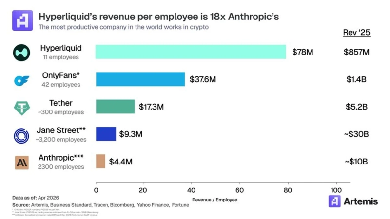 - According to Artemis, Hyperliquid recorded $78 million in revenue per employee in 2025 and total revenue of $857 million.