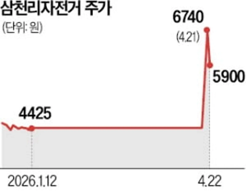 Samchuly Bicycle closed at 5,900 won on April 22. The stock has climbed 43.2% since trading resumed on April 20 after the delisting risk was cleared. Shares surged more than 50% in the first two sessions after trading restarted before surrendering some of those gains on April 22.