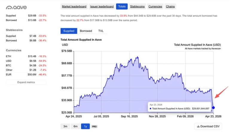 Wu Blockchain reported on April 23 that Aave’s total value locked fell to about $29.6 billion from roughly $45.8 billion after a vulnerability incident involving KelpDAO’s rsETH.