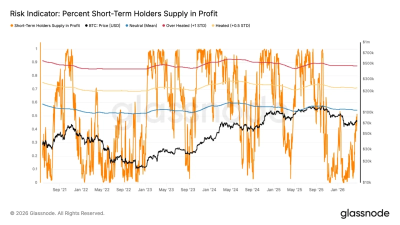 In the near term, selling pressure is building as Bitcoin runs into resistance. Glassnode said Bitcoin is attempting a structural rebound, but strong selling may emerge near the average cost basis of short-term holders at $80,100. As prices approach breakeven levels, the incentive to lock in profits is increasing. Realized gains among short-term holders have risen, and patterns associated with local tops are reappearing. Spot demand has recovered somewhat, but not enough to absorb the supply. The decline in volatility also reflects a broader wait-and-see mood and weak conviction across the market.