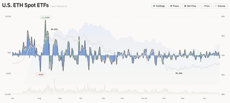Data compiled by Trader T on April 23 showed $75.94 million in net outflows from US spot Ether ETFs.