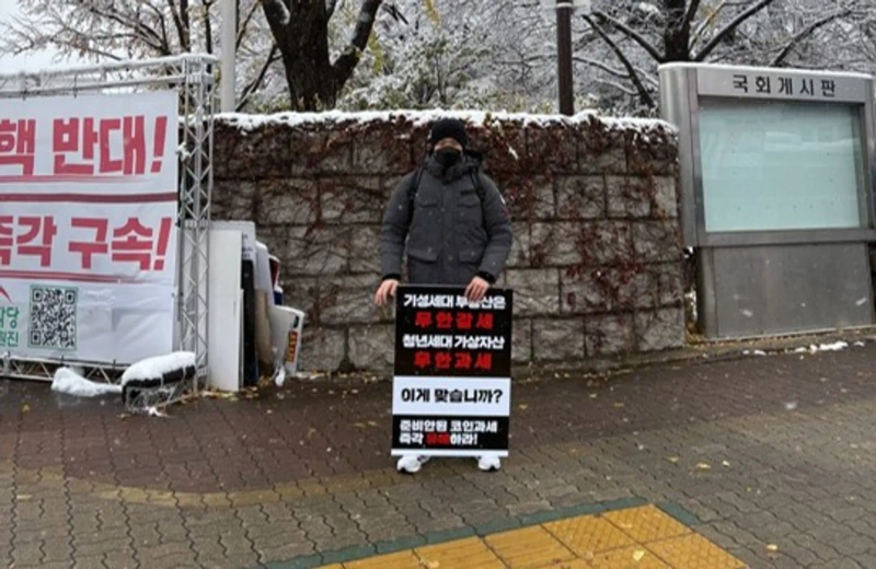On the 27th, there was a one-person protest against the virtual asset tax in front of the National Assembly. Introducing himself as Bulgae Mi Crypto (also known as Lee Ha Bulgae Mi), he said, "I thought that the financial investment income tax (financial investment tax) would be abolished, and naturally, Coinone tax would also be exempted, but the situation is different from what I expected," he said. He added, "I studied a lot about the virtual asset tax for the protest, but I think it's a law that shouldn't be enforced," he said.