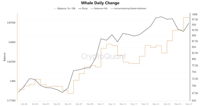 As the price of Bitcoin (BTC) temporarily dropped, it was reported that large investors made significant purchases. On the 28th (local time), Cointelegraph reported that "large Bitcoin investors purchased approximately 1.5 billion dollars worth of Bitcoin from the market," and stated that "currently, Bitcoin is heading towards 100,000 dollars."