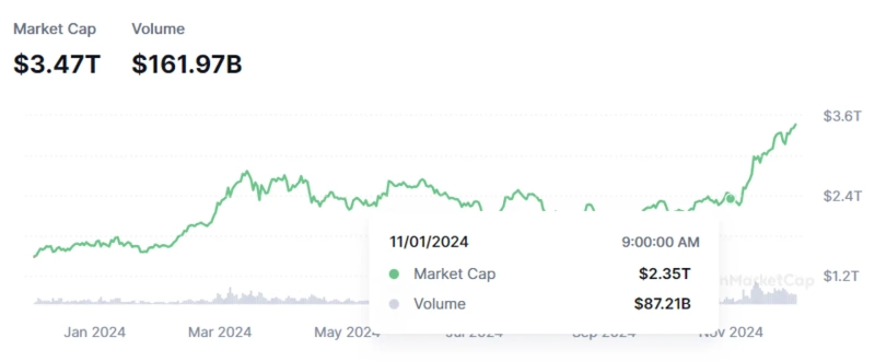 According to Watcher Guru on the 2nd (local time), the total market capitalization of virtual assets increased by over 1 trillion dollars during the month of November. In fact, as of November 1st, the total market cap recorded approximately 2 trillion 350 billion dollars on CoinMarketCap, and by November 30th, it recorded approximately 3 trillion 400 billion dollars.