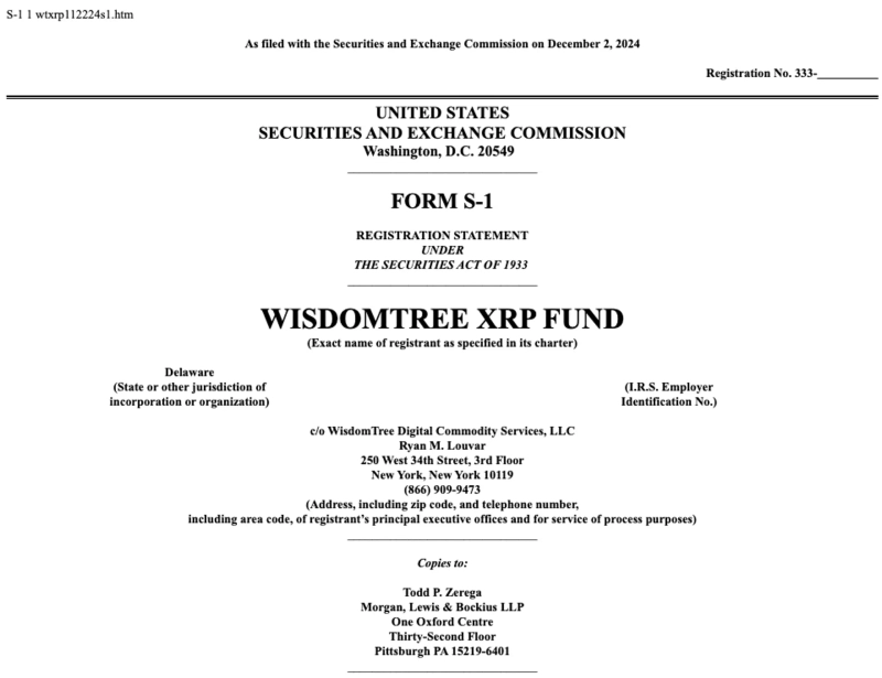 - WisdomTree announced that it submitted a Ripple (XRP) Spot ETF S-1 application to the US SEC.