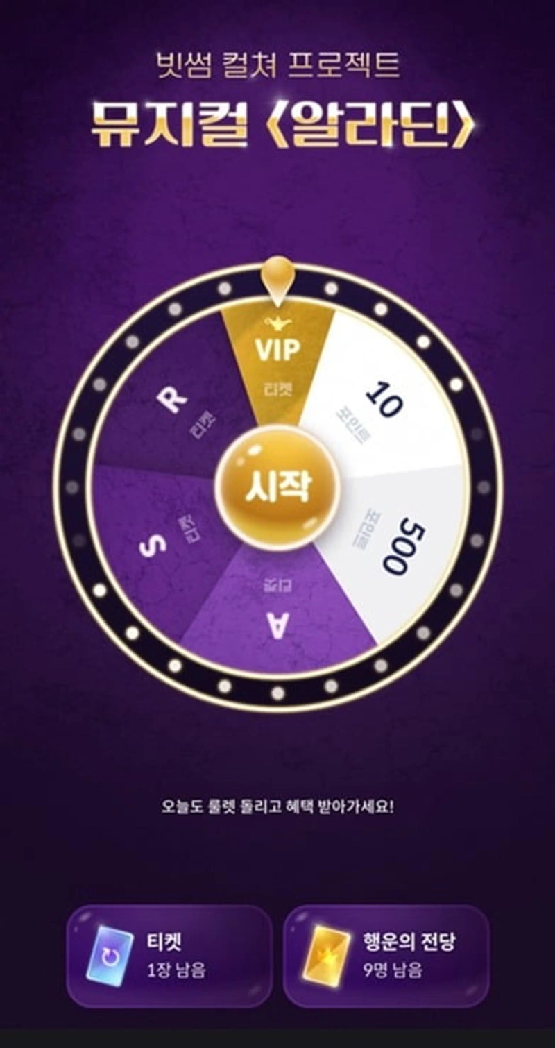 By spinning the roulette, participants can receive ▲VIP seat management rights for the musical Aladdin ▲R seat ▲S seat ▲A seat tickets or ▲points that can be exchanged for virtual assets at Bitsol through a draw.