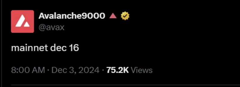 Avalanche (AVAX) is set to conduct its largest mainnet upgrade soon. On the 3rd (local time), Avalanche announced through its official X (formerly Twitter) that it will carry out the largest mainnet upgrade named 'Avalanche 9000' on December 16th. This is expected to be the largest network upgrade since the mainnet launch in September 2020. The upgrade is anticipated to bring significant improvements in scalability and cost efficiency.