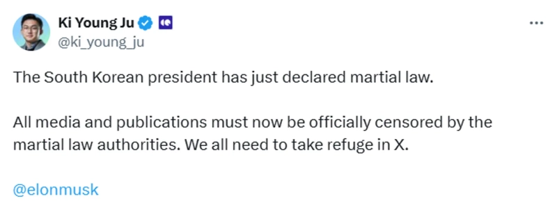Ju Ki-young, CEO of CryptoQuant, stated on the 3rd (local time) via X (formerly Twitter) that "the Korean president has declared martial law" and "all media and publications must be controlled by the martial law command."