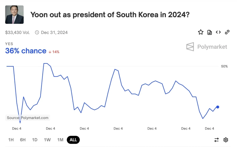 - At Polymarket, President Yoon sees a 40% chance of being re-elected as president this year.