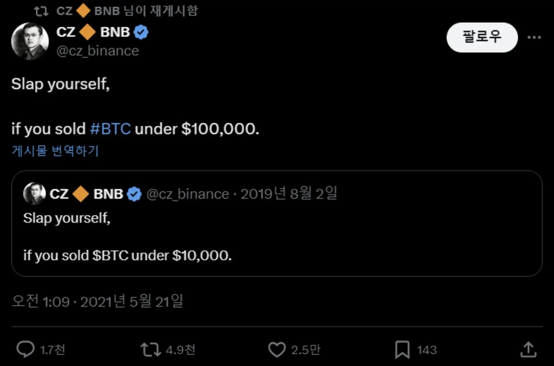 Changpeng Zhao, the founder of Binance, posted something suggesting that Bitcoin (BTC) would reach $100,000.