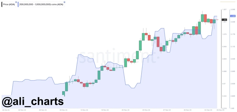 According to Crypto Basic on the 5th (local time), virtual asset analyst Ali Martinez stated, "In the past 24 hours, whales have accumulated over 100 million ADA." Whales invested $110 million when Cardano's price exceeded $1 and currently hold 3.26 billion ADA.