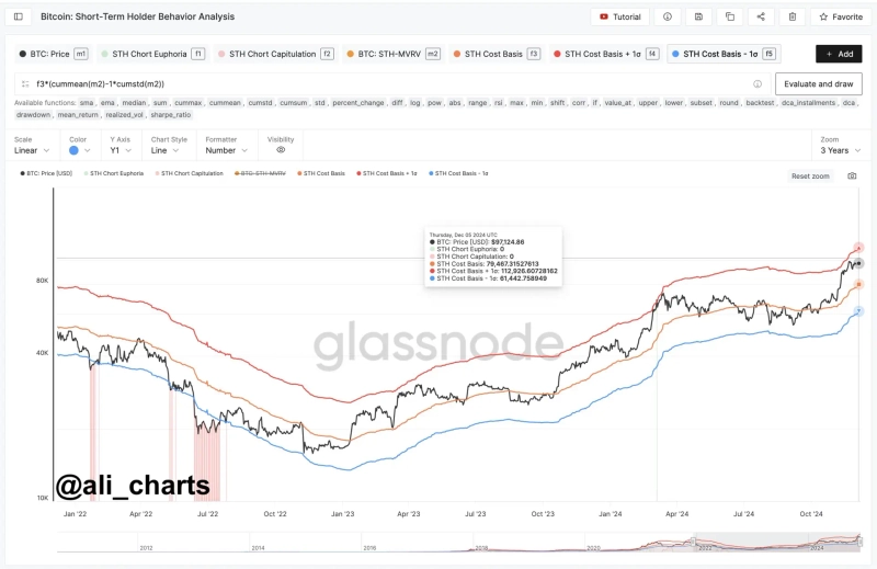 On the 5th (local time), virtual asset analyst Ali Martinez stated on X, "Bitcoin's short-term peak is formed at a level that adds +1 standard deviation to the average purchase price of short-term holders," and "this is around $112,926."