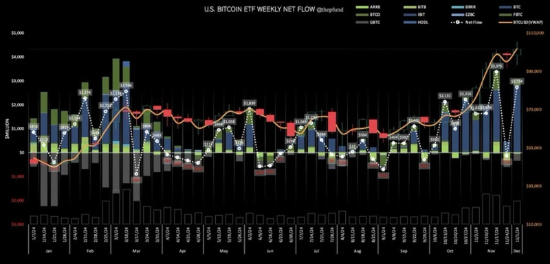 - The US Bitcoin spot ETF reported a net inflow of approximately $2.734 billion last week.