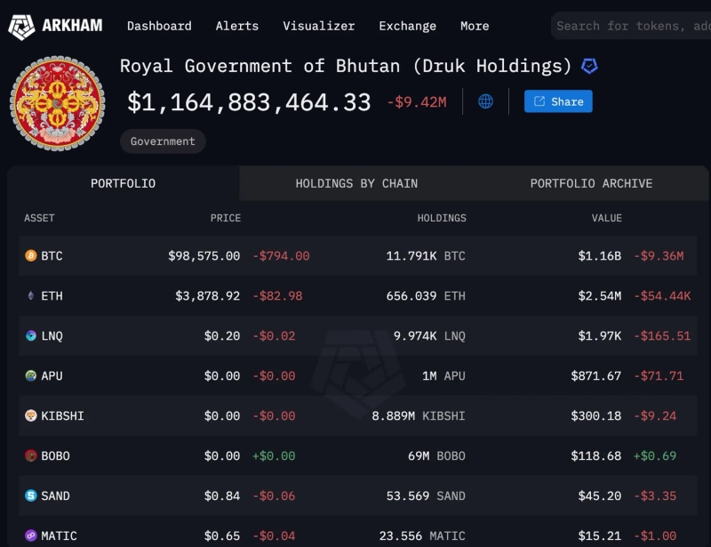 According to the on-chain analysis platform Arkham Intelligence, the Bhutan government currently holds a total of 11,791 Bitcoins.