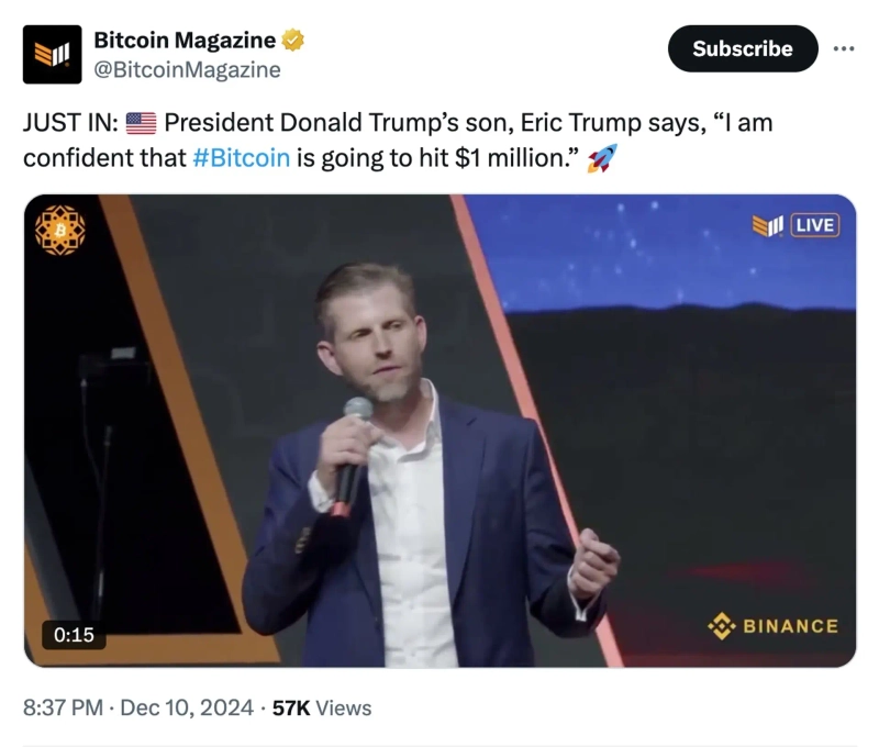 - Eric Trump expressed confidence that Bitcoin will rise to $1 million.