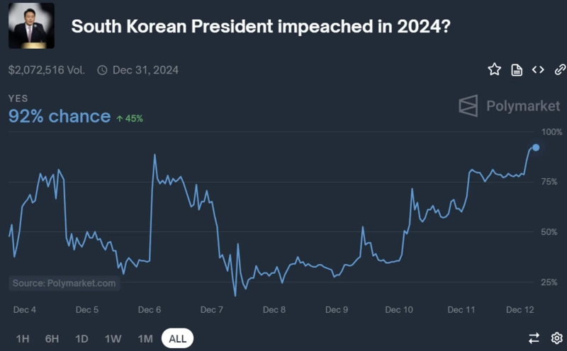 - Polymarket reports that the impeachment probability of President Yoon Suk-yeol has surged to 92%.