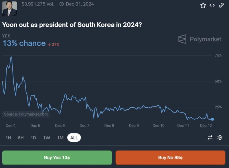 The probability of President Yoon Suk-yeol's voluntary resignation has significantly dropped. In a bet attracting about $4 million, the possibility of his resignation is still seen at 13%.