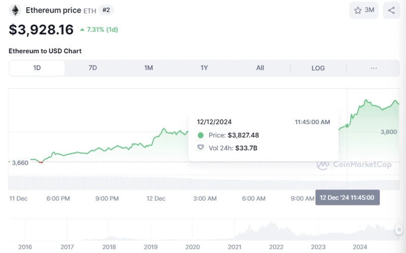 Following this news, buying pressure surged for Ethereum. As of 3 p.m. that day, Ethereum is trading at $3,929, up 7.53% from the previous day.