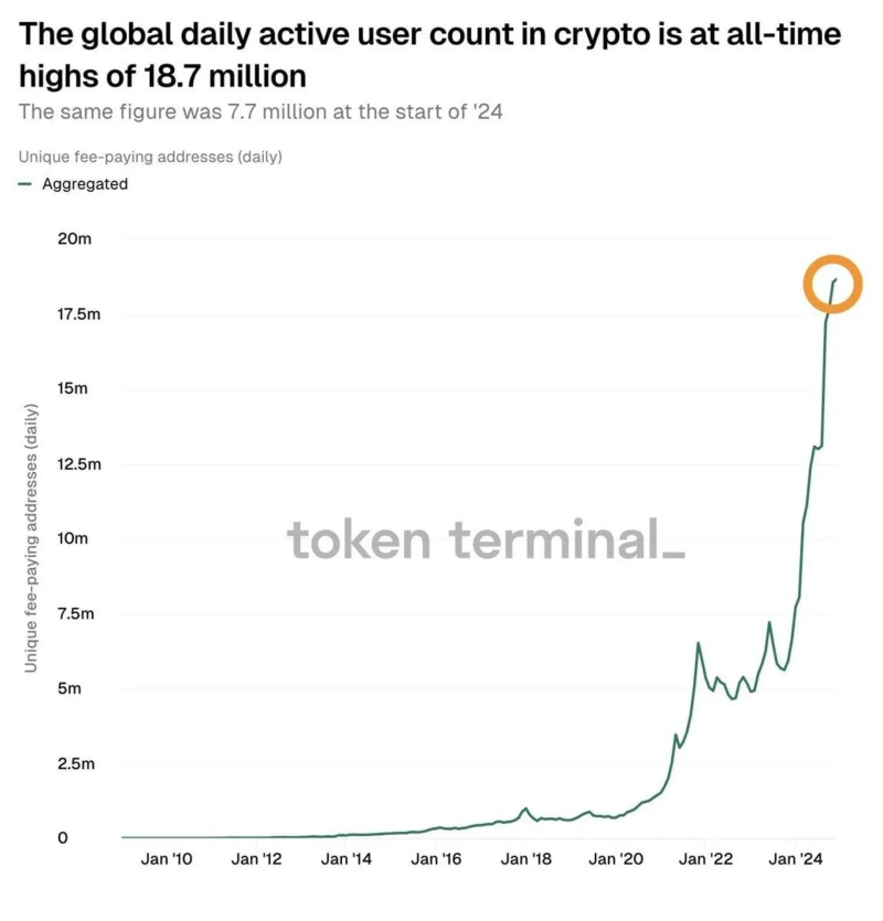 On the 13th (local time), Cointelegraph reported via X that "the daily active users of cryptocurrencies in December reached 18.79 million," stating "this is more than double the figure from early this year, which was 7.7 million."