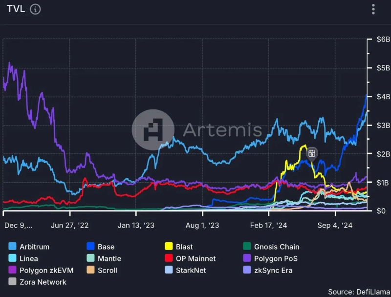 On the 13th (local time), Satoshi Club announced on X that "Base Protocol is the first Ethereum network to surpass $4 billion in TVL since Polygon (MATIC) PoS," adding that "it has also outperformed Arbitrum (ARB) in decentralized exchanges (DEX), daily transactions, and active addresses." Furthermore, it was noted that Base Protocol is dominating in stablecoin usage as well.