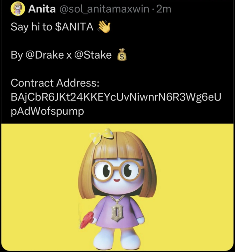 According to the cryptocurrency specialist media The Block on the 15th (local time), Drake's X account posted content promoting a Solana-based meme coin called ANITA.