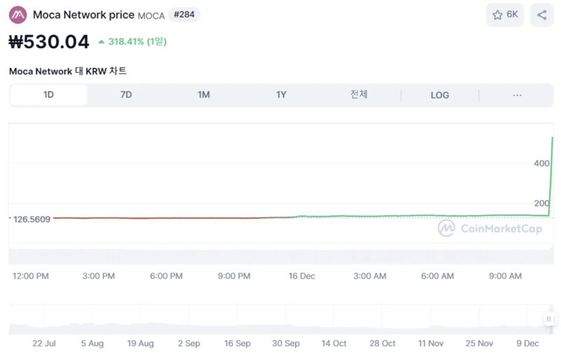 As of 11:03 AM on the 16th, Mocanetwork is recording 530 won, a 320% surge compared to the previous day, based on CoinMarketCap.