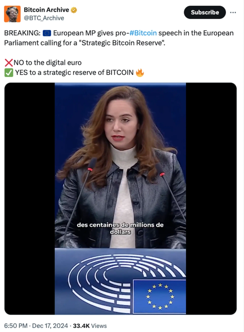 On the 17th, the cryptocurrency-focused media Bitcoin Archive reported, "One of the members of the European Parliament urged in a speech that Europe should strategically hold Bitcoin."
