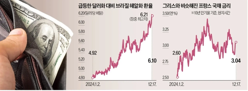 The exchange rate of the Canadian dollar against the US dollar also soared to 1.43 Canadian dollars per dollar on this day, the highest level since March 2020 when the global financial market shock occurred due to the COVID-19 pandemic. This was due to the sudden resignation of Deputy Prime Minister and Finance Minister Chrystia Freeland, who refused to expand fiscal spending led by Prime Minister Justin Trudeau. In France, a key currency country, the coalition government led by Prime Minister Michel Barnier collapsed after conflicts over next year's budget plan, causing national bond interest rates to soar. On this day, the interest rate on France's 10-year government bonds was 3.04% per annum, fluctuating at a level similar to the 3.10% per annum interest rate on Greece's 10-year government bonds during the financial crisis over a decade ago.