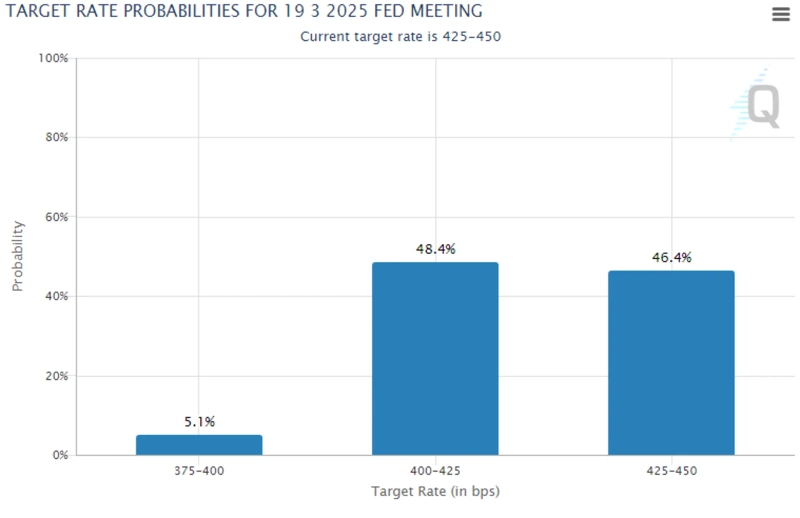 According to data from the Chicago Mercantile Exchange (CME) FedWatch platform, 48.4% of market participants expect the FOMC meeting on March 25 next year to decide on a 25bp cut to 4.00~4.25%, while 5.1% expect a 50bp cut to 3.75~4.00%. 46.4% predicted that rates would remain unchanged.