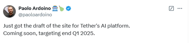 Paolo Ardoino, the CEO of Tether (USDT), announced on the 20th (local time) via X (formerly Twitter) that "the Tether AI platform website is expected to launch by the end of the first quarter next year," adding that "I just received the draft of the site."