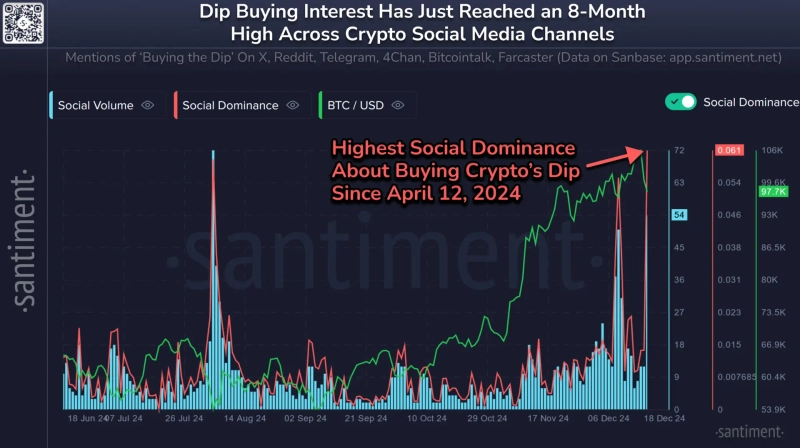 On the 20th (local time), Santiment reported on X, "Bitcoin (BTC) fell to $95,500, and mentions of cryptocurrency purchases on SNS reached an 8-month high," adding, "This ratio surged when Bitcoin plummeted on August 4th (Black Monday)." They further explained, "After Black Monday, Bitcoin's market capitalization increased by 81%."