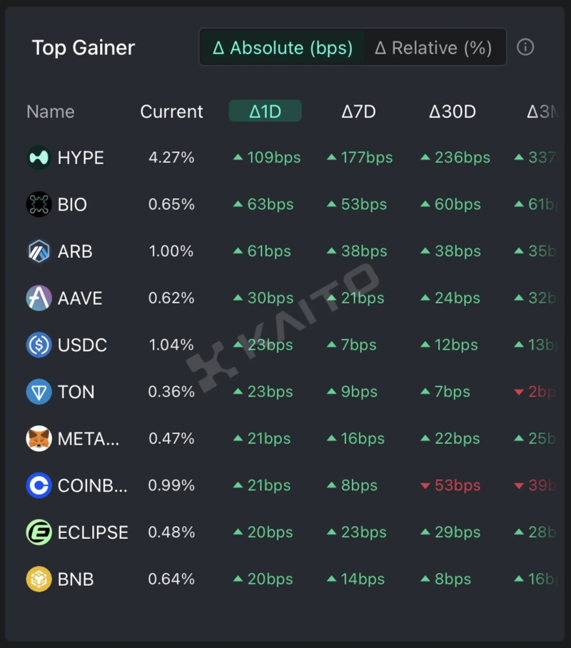 According to the top gainers in the Token Mindshare (a metric quantifying the influence of specific tokens within the crypto space) of the AI-based Web3 search platform Kaito, as of the 24th, the top five cryptocurrency-related keywords attracting the most attention are Hyperliquid (HYPE), Bio (BIO), Arbitrum (ARB), Aave (AAVE), and USD Coin (USDC).