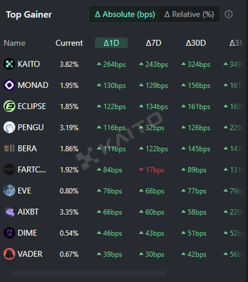 Kaito, which ranks first, is drawing significant interest from investors due to the ongoing YAP Point airdrop event. YAP Points are part of an incentive program designed to encourage user participation within the Kaito platform. Users can earn YAP Points by participating in programs, sharing content, tweeting about cryptocurrencies, and inviting friends using Kaito YAP. Some users have posted over 200 posts a day to accumulate YAP Points.