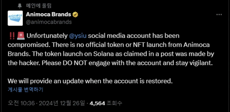 On the 26th, Animoca Brands announced via its official X (Twitter) account, "The account of Yat Siu, co-founder of Animoca Brands, has been hacked. Animoca Brands has not officially released any tokens or NFTs. Information about the release of Solana (SOL)-based tokens is also the work of hackers. Please remain vigilant until further updates."