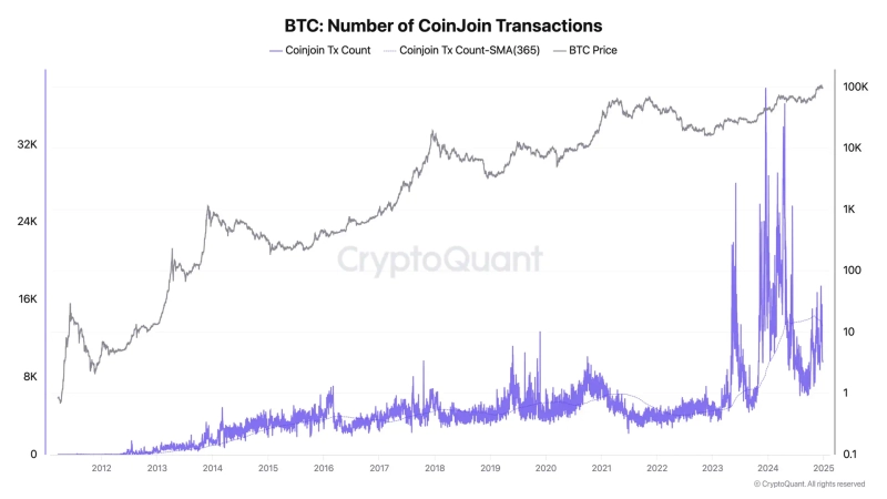 On the 26th (local time), Ki Young Ju, CEO of the on-chain analysis platform CryptoQuant, stated on his X (Twitter) that "the annual average number of CoinJoin transactions has increased more than threefold over the past two years. Some argue that this is due to hackers laundering stolen funds, but a significant portion of these transactions this year has been driven by inflows from Exchange-Traded Funds (ETFs) and custodial accumulation addresses."