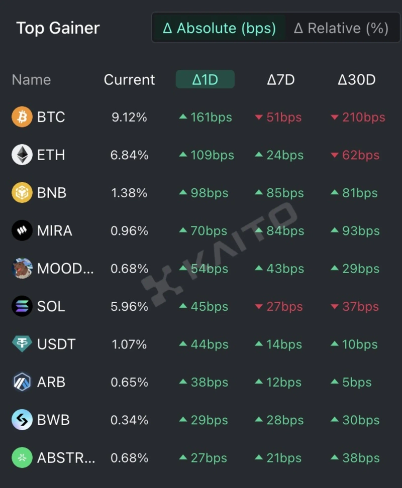 According to the top gainers on the AI-based Web3 search platform Kaito's Token Mindshare (a metric quantifying the influence of specific tokens in the crypto market), the top five cryptocurrencies currently attracting the most attention are Bitcoin (BTC), Ethereum (ETH), BNB, Mira, and Moodeng.