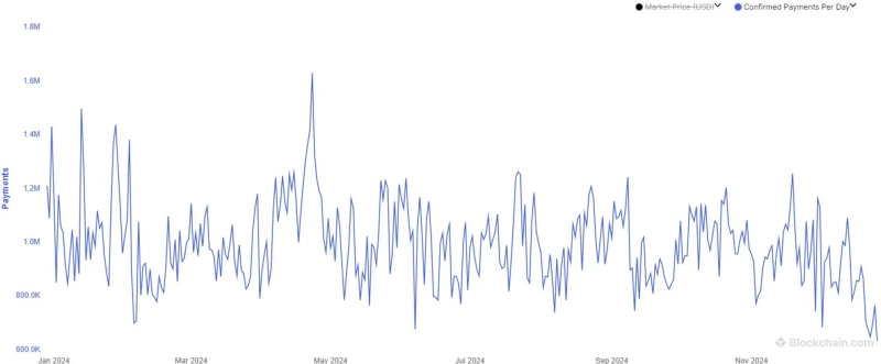 The daily transaction count of Bitcoin (BTC) has hit an annual low.