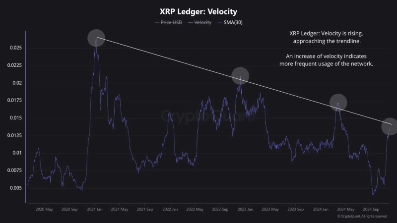 On the 27th (local time), 'JA_Maartun', a contributor to the on-chain data analysis platform CryptoQuant, stated, "An increase in circulation speed means that the frequency of network usage is rising," and judged that "Ripple is currently showing this pattern and is likely to break through the trendline."