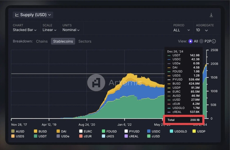 - The total supply of stablecoins has surpassed $200 billion, setting a new all-time high.