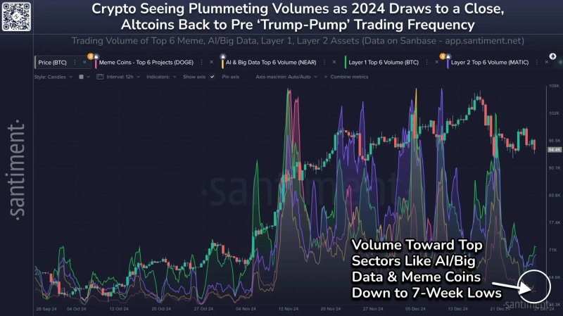 On the 27th (local time), Santiment announced on X, "As the end of the year approaches, the overall trading volume in the cryptocurrency market has significantly decreased," and added, "This week's major altcoin trading volume has decreased by 64% compared to last week." They further explained, "It is common for speculative altcoin trading volumes to decrease at the end of the year," but also projected, "If whales continue a strong accumulation trend during this time when retail investors are not participating, a large-scale bull market could emerge."