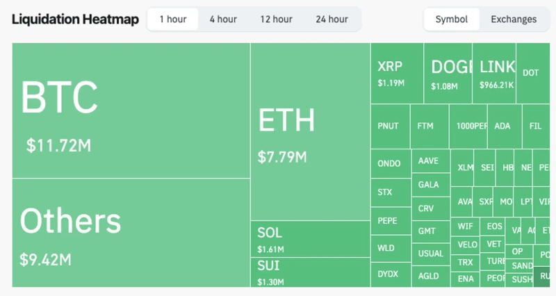 During the same period, Bitcoin long liquidations amounted to $11.96 million, and Ethereum long liquidations were $7.95 million.