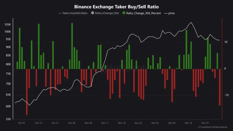 On the 31st (local time), CryptoQuant author Crazzyblockk stated, "By analyzing the 30-day rate of change indicator for Binance market buy/sell orders, we can gauge the extent of aggressive buy or sell orders executed by futures investors. Recently, the 30-day rate of change indicator for Binance market buy/sell orders shows that while the buying pressure has decreased, the selling pressure has significantly increased."