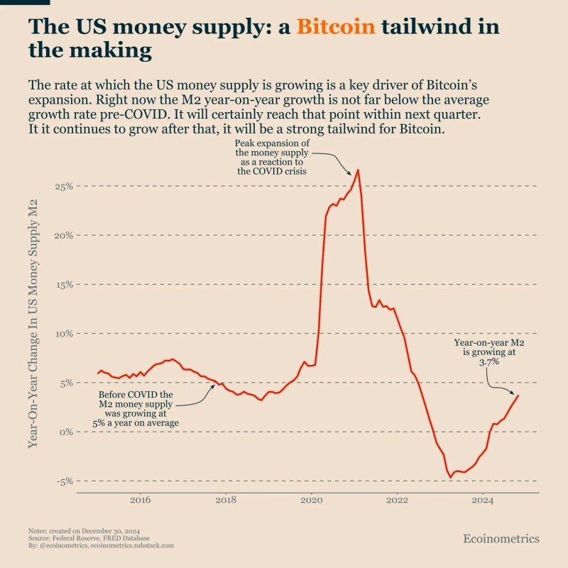 On the 30th (local time), Ecoinometrics stated on X, "The M2 (financial products issued by deposit-taking institutions, cash currency, transaction deposits, deposits of less than two years) growth rate has reached 3.7%," adding, "It continues to show an upward trend, reaching the average pre-COVID-19 money growth rate of 5%." Furthermore, they mentioned, "Historically, an increase in money supply has promoted the adoption of Bitcoin," and "it will act as new momentum in the Bitcoin market."
