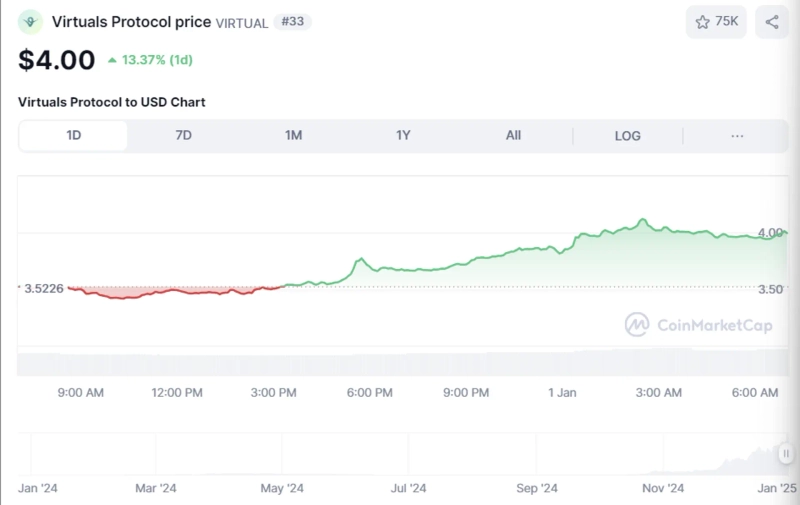 - Virtual Protocol recently reported a 13.34% rise to reach $4, driven by increased interest in artificial intelligence.