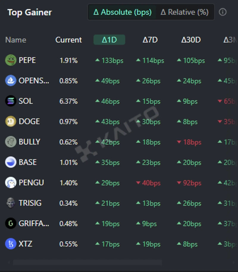 According to the Token Mindshare (a metric quantifying the influence of specific tokens in the crypto market) top gainers from the AI-based Web3 search platform Kaito, the top 5 cryptocurrencies garnering the most attention as of the 1st are Pepe (PEPE), OpenSea, Solana (SOL), Dogecoin (DOGE), and Dolos the Bully (BULLY).